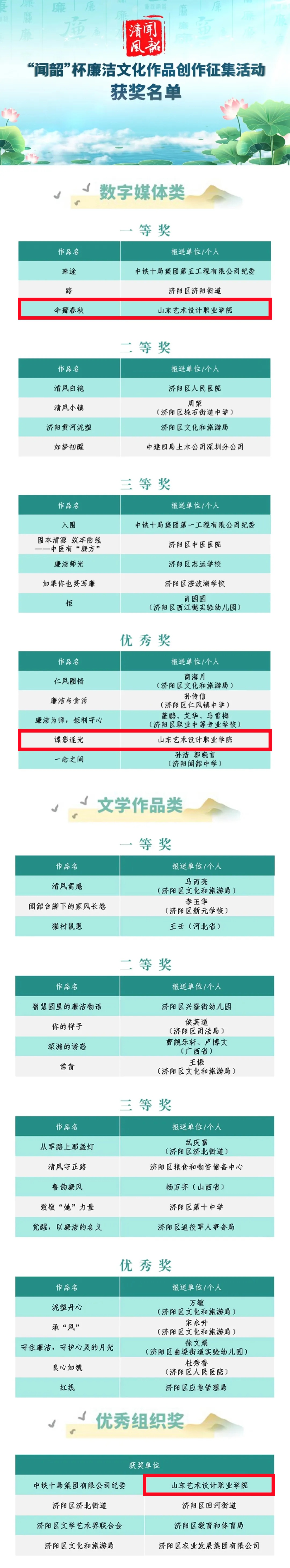为深入贯彻习近平文化思想,进一步推进新时代廉洁文化建设,推动党员干部筑牢廉洁自律意识,在全社会培育崇廉尚洁的价值理念,由济阳区纪委监委、济阳区委宣传部、济阳区文化和旅游局、济阳区融媒体中心、济阳区文学艺术界联合会、济阳区农业发展集团有限公司联合举办的“闻韶”杯廉洁文化作品创作征集活动圆满落幕。活动面向社会征集数字媒体类、文学作品类两大类作品,历时两个半月,共收到参赛作品320部。经过初评、复评、终评三轮严格评审,学校师生作品凭借鲜明的主题立意、扎实的专业功底和富有感染力的艺术表达脱颖而出,荣获多项奖项,学校同时获评“优秀组织奖”。
