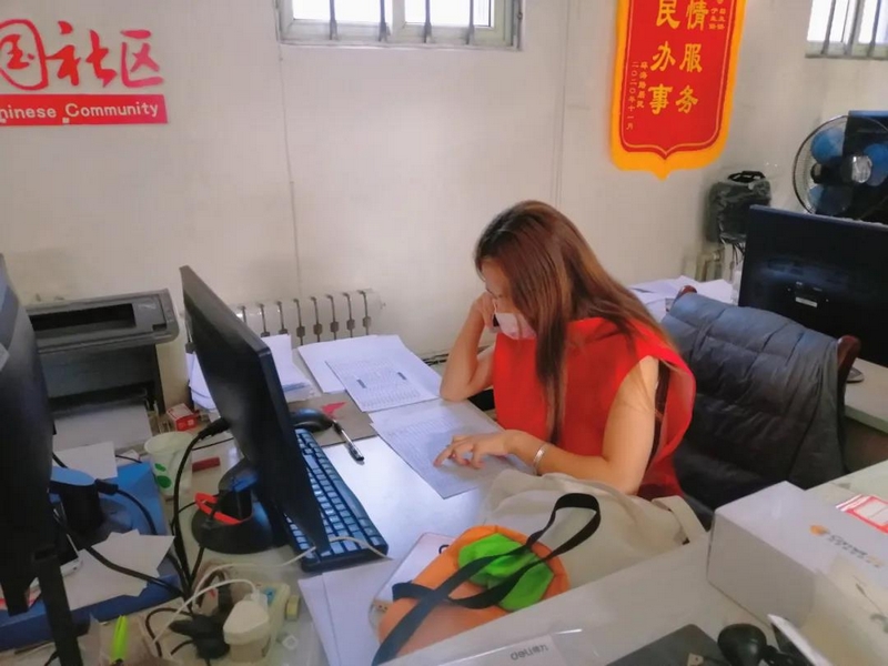 吴佩瑶同学放假回到家乡严守当地防疫要求,于7月底完成居家隔离。8月初,她在网上看到了烟台市芝荹区环海路幸福街道发的志愿者招募信息,毫不犹豫果断报名。第二天她便接到通知担起志愿服务工作。吴佩瑶同学每天或身着“红马甲”,在当地党员干部的带领下,负责社区防疫宣传,做好疫情信息的收集、上报,做到不遗户、不漏户;或冒着酷暑高温穿着防护服,为出入社区人员测量体温、排查疫区来往人员等。