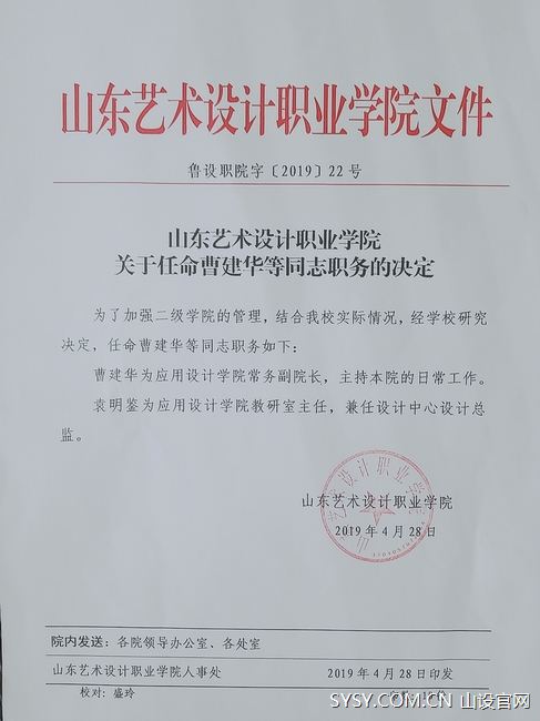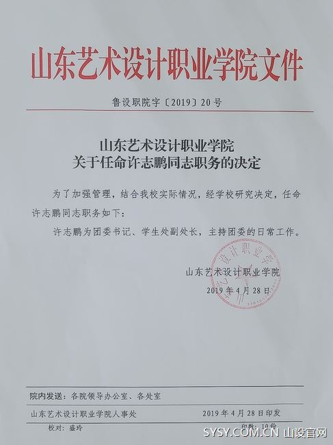 会议宣布:任命许志鹏为团委书记、学生处副处长;任命曹建华为应用设计学院常务副院长;任命袁明鉴为应用设计学院教研室主任;任命耿旻为宣传部新闻中心主任。
