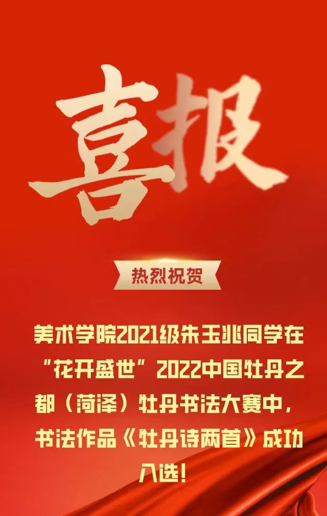 “花开盛世”2022中国牡丹之都(菏泽)牡丹书法作品大赛由菏泽市人民政府主办。为进一步鼓励牡丹文化艺术创作,推出更多展示牡丹风姿、挖掘牡丹文化内涵的优秀书法作品,特举办“花开盛世”2022中国牡丹之都(菏泽)牡丹书法作品大赛,此次比赛面向国内外征集以牡丹及其相关元素为主题的诗、词、联、赋等书法作品,真、草、隶、篆、行等书体皆可,遵循主题鲜明、风格独特、形式多样的原则,彰显牡丹的独特魅力和文化内涵。本次大赛评选入展作品100幅,其中山东艺术设计职业学院美术学院2021级书法班朱玉兆同学的作品《牡丹诗两首》成功入选!
