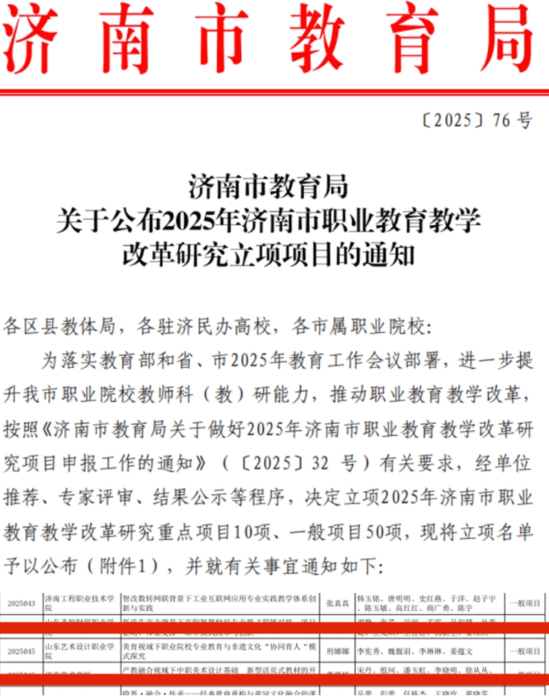 近日,济南市教育局公布了2025年职业教育教学改革研究项目立项名单,我校美术学院邢娜娜老师主持的《美育视域下职业院校专业教育与非遗文化 “协同育人” 模式探究》获批立项。